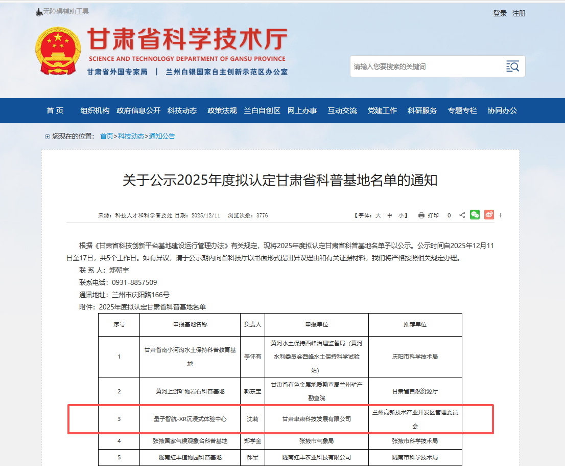 12月11日,甘肃省科学技术厅依据《甘肃省科技创新平台基地建设运行管理办法》公示了2025 年度拟认定科普基地名单,甘肃聿肃科技发展有限公司“量子智航-XR沉浸式体验中心”凭借创新的科普模式与技术实力成功入选 !