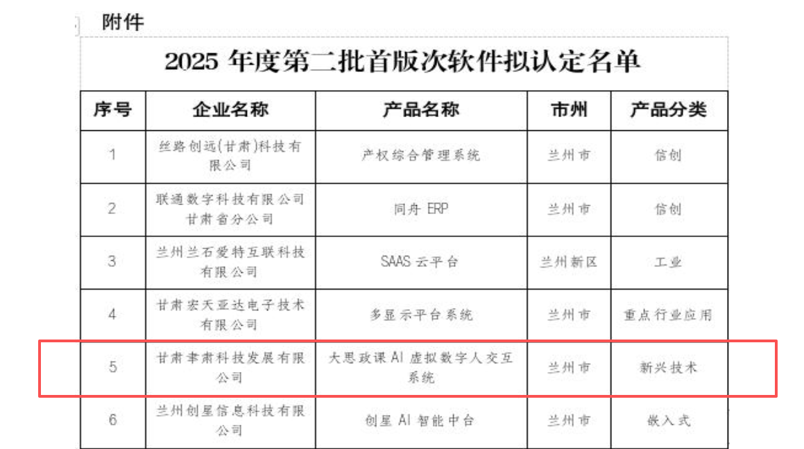2026年1月19日,甘肃省工业和信息化厅发布2025年度甘肃省第二批首版次软件产品认定名单公示,甘肃聿肃科技发展有限公司自主研发的《大思政课AI虚拟数字人交互系统》成功入选!