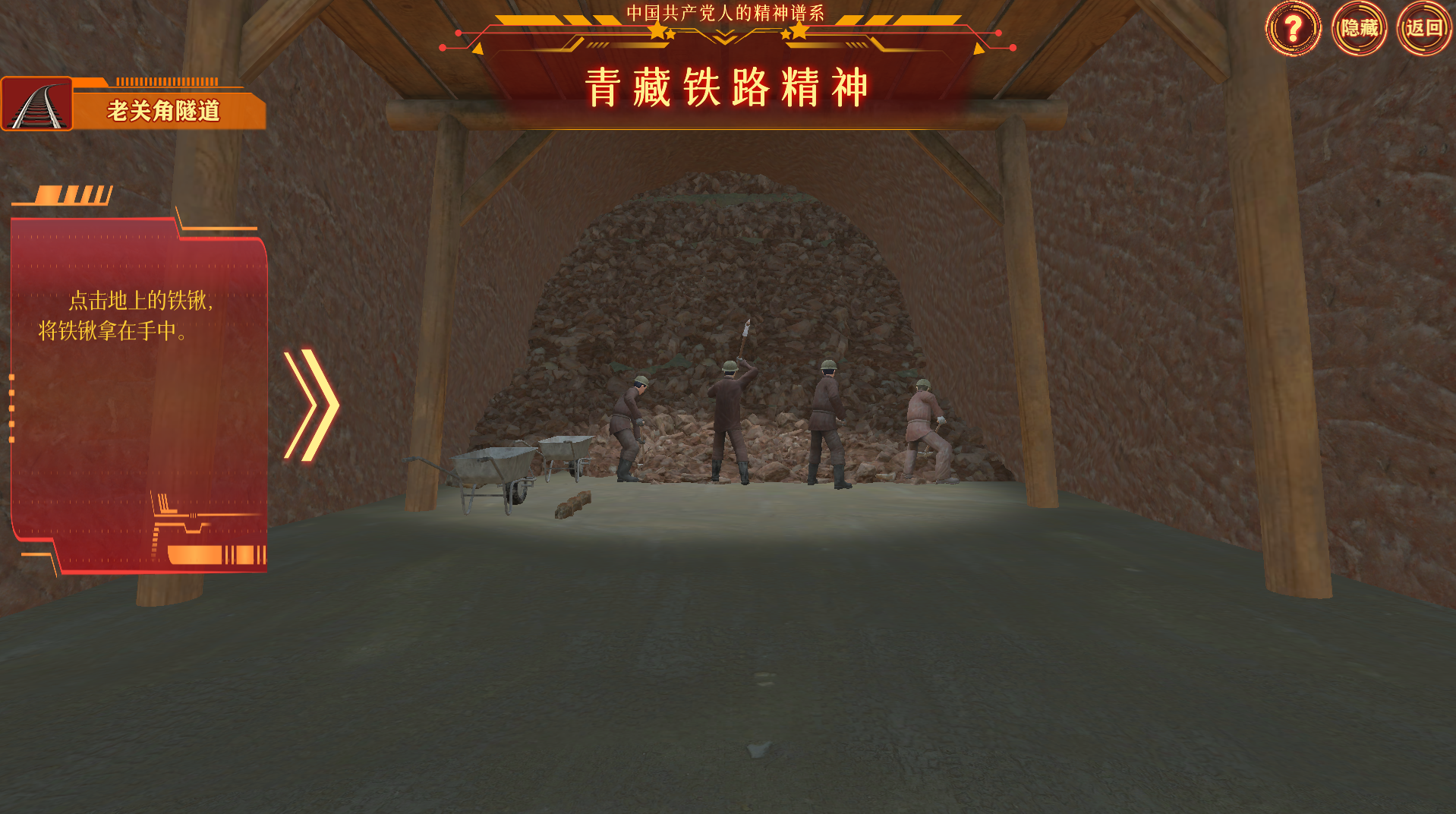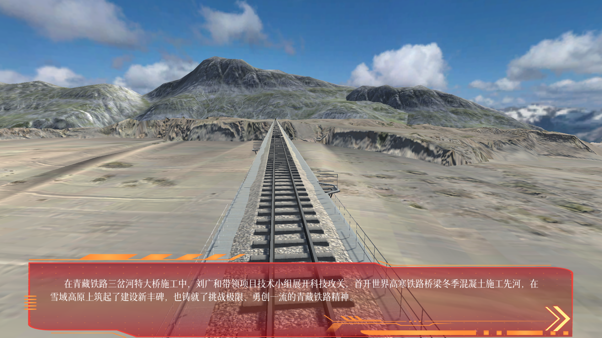 此教育系统主要以青藏铁路精神传播的首要内容,也是让体验者了解青藏铁路精神的主要内容,了解青藏铁路精神过程的主要精神和文化。体验者通过光学眼镜进入模拟场景中。通过模拟出的青藏铁路建设的模拟场景,让体验者身临其境的了解青藏铁路开工建设以来,1800 多个日日夜夜,5 度炎夏寒冬,十多万建设大军在“生命禁区”,冒严寒,顶风雪,战缺氧,斗冻土,以惊人的毅力和勇气,挑战极限,战胜各种难以想象的困难,攻克了“高寒缺氧、多年冻土、生态脆弱”三大难题,学习建设者以敢于超越前人的大智大勇,拼搏奋斗,开拓创新,攀登不止,在雪域高原上筑起了中国铁路建设新的丰碑,也铸就了挑战极限、勇创一流的青藏铁路精神。
