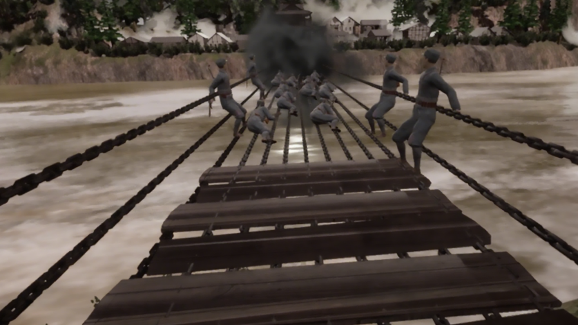 在飞夺泸定桥中,体验者扮演22名勇士中的一人参与飞夺泸定桥,画面中的UI提示以及战友被击落掉入水中的场景,深切感受到夺取泸定桥的艰辛,通过这种沉浸式的VR体验,给人从身体到心灵都展示出强烈震撼,从而通过回顾历史,进而对飞夺泸定桥有更加深刻的认识。