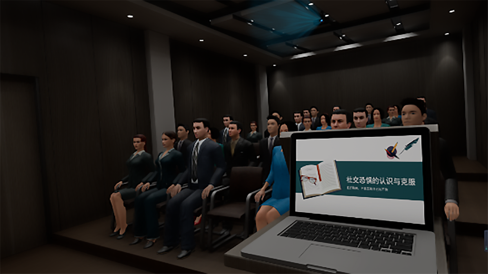 体验者进入模拟的小会堂,体验者可选择演讲者或者观众任意一种身份,当体验者选择演讲者身份时,需大声读出屏幕上显示内容,进行演讲训练。当体验者选择聆听者身份时,只需静待台上的演讲者将内容读完即可,此模块含有4个演讲课题,分别是《社交恐惧的认识与克服》、《海燕》、《我又一个梦想》、《相信未来》,利用虚拟现实的交互技术可以使那些胆怯现场演讲的人得到很大的锻炼。